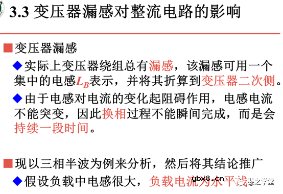 3.3 变压器漏感对整流电路的影响 在单相可控整流电路和三相可控整流电路的基础讲解中,为了理解的方便性,都忽略了变压器漏感对整流电路的影响。实际上,在相控整流电路中,变压器绕组总有漏感,该漏感可用一个集中