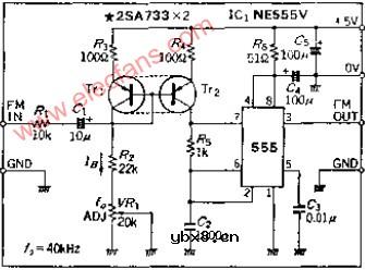 使用555的FM调制电路 电路的功能 改变555的自激多谐振荡器的充电电流即可进行频率调制。值得注意的是如大幅度地改变充电电流,还可作为VCO使用。这种振荡器的振荡频率在100KHZ以下,本电路的频率为40KHZ,这一频率