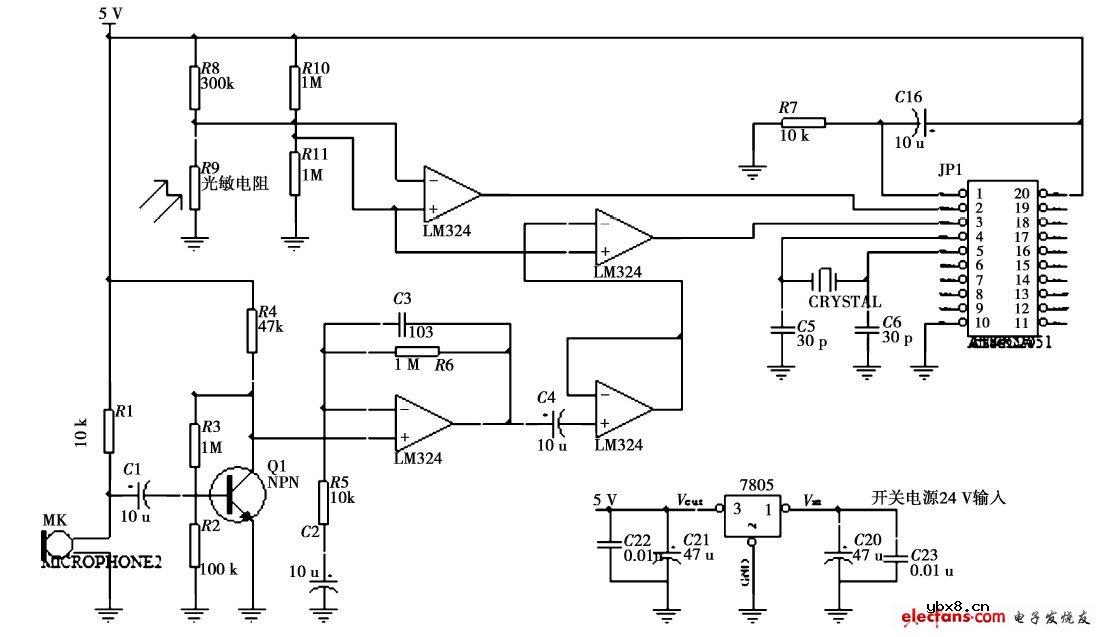 基于AT89C2051的智能控制器电路如下图所示,其主要由传感器单元、A \\D 转换单元、控制器单元组成。AT89C2051芯片用于对来自声控和光控传感器检测到的信号经过整形以后的信号数据做处理,进而控制LED 驱动器。