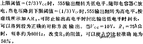 图中所示电路是由555时基集成电路组成的占空因素为50%的多谐振荡器,输出电流可达200MA。当3脚输出为高电平时,输出电压通过R对C充电,时间常数为RC,当电容器C上电压充到