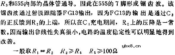 图中是由555组成一个温度无关的音频锯齿波发生器,锯齿波线性可以控制达到1%以内.图中555接成无稳态多谐振荡器.电容器C1由电源电压通过R1、R2、R3充电.放电是通过