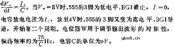 图中所示是用555时基集成电路组成的可调节对称的三角波发生器,频率可达100KHZ.恒流源I1、I2由三极管BG1控制,BG1导通时,I1对C充电,VO输出线性斜波,充电斜率