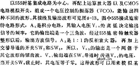 些管乐器的声音.这四种波形经过混频,能够产生谐波丰富的音乐,在电子乐器中很有用处.图中的电路实际上是一个压控振荡器,按图中的元件值,变换系数约为2KHZ/V.改变积分电
