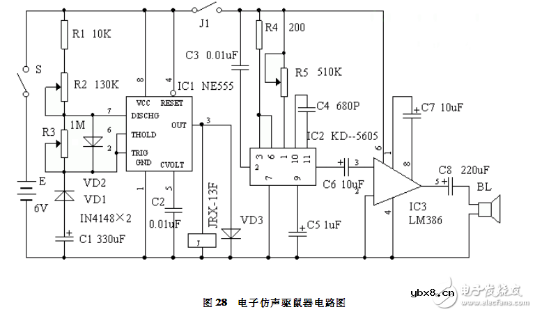 猫是老鼠的天敌,利用电子装置来模拟猫叫声驱鼠是一种有效的方法。由于是电子装置,猫叫声可大可小,可快可慢,间隔时间可长可短,且电路结构简单、成本低廉,适合电子爱好者自制用于家庭。