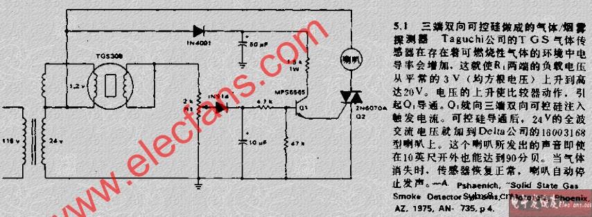 三端双向可控硅做成的气体 烟雾探测器电路