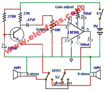 门禁电话通话电路图 In this doorphone circuit,an 8 ohm speaker is used both as a microphone and also an output device. The BC109C stage amplifies in common base mode, giving good voltage gain , whilst