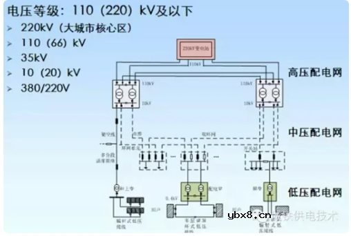配电网的概念 配电网是指将高压输电网输送到的电能转换为安全、稳定的低压电能,并将电能输送到最终用电设备的系统。常常被称为“用电网”或“送电网”。与输电网的区别在于,配电网的电压等级一般低于110千伏,